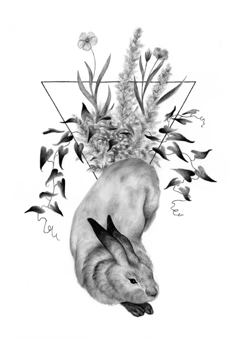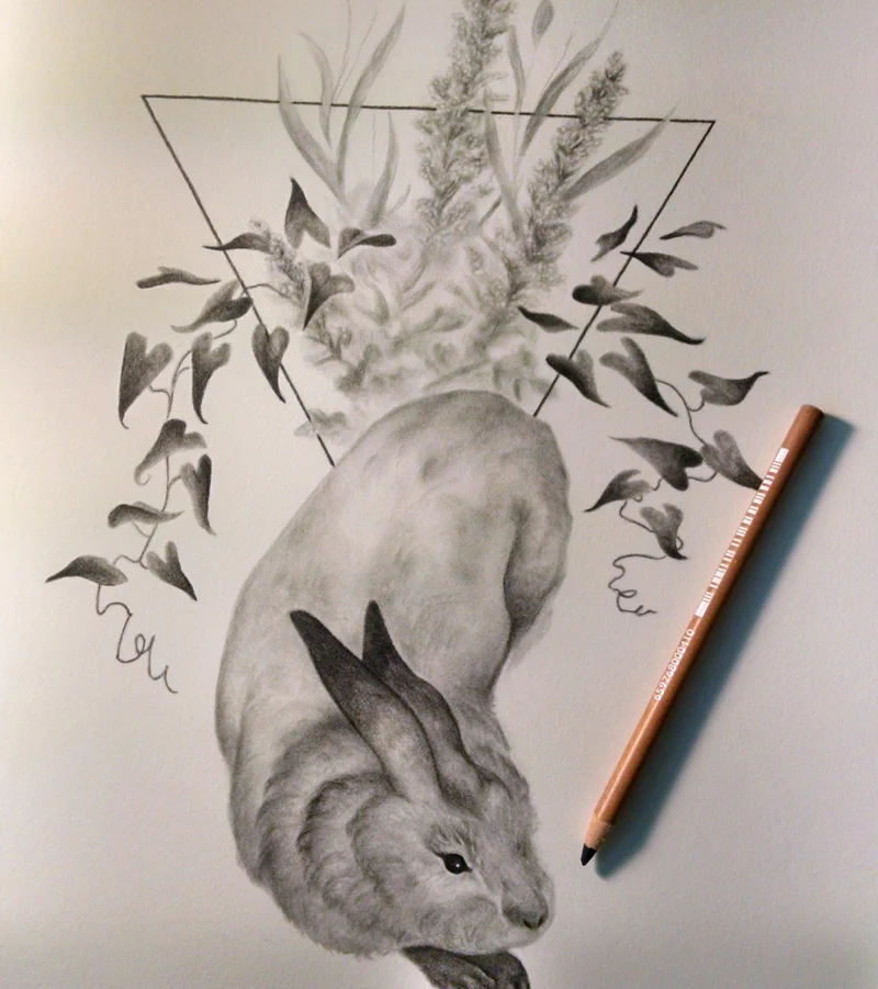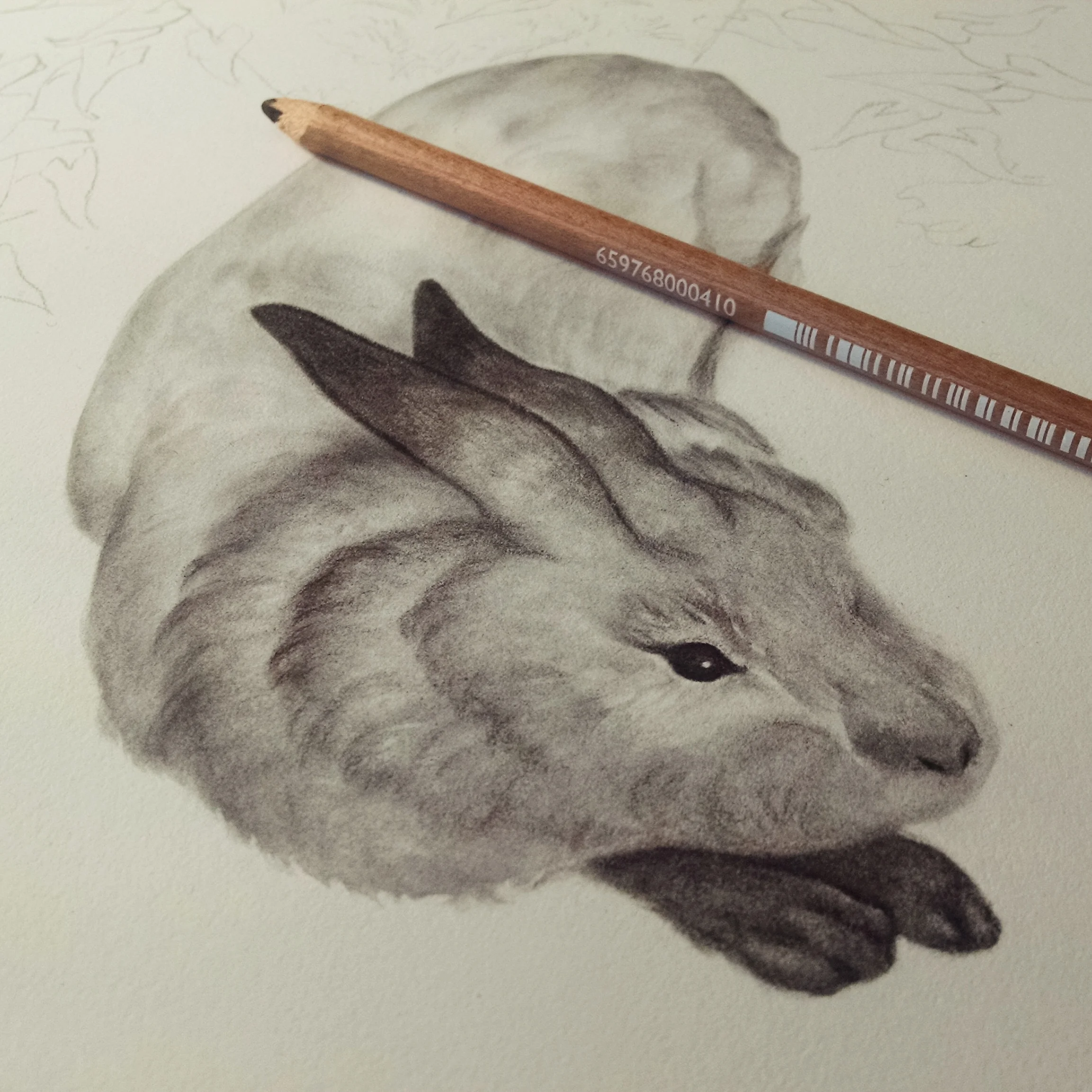After transferring and refining the sketch I come in with powdered charcoal for some base values - especially in the softer areas like fur or sky - then add details and texture using a carbon pencil.