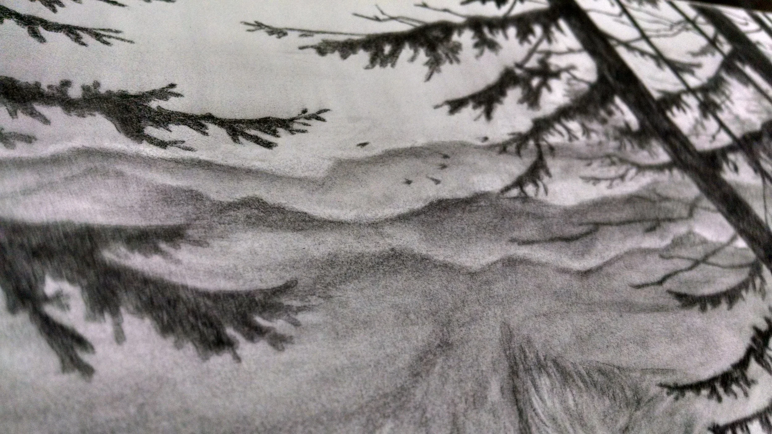 With the details fleshed out in pencil I begin to add value using layers of powdered charcoal and carbon pencil.